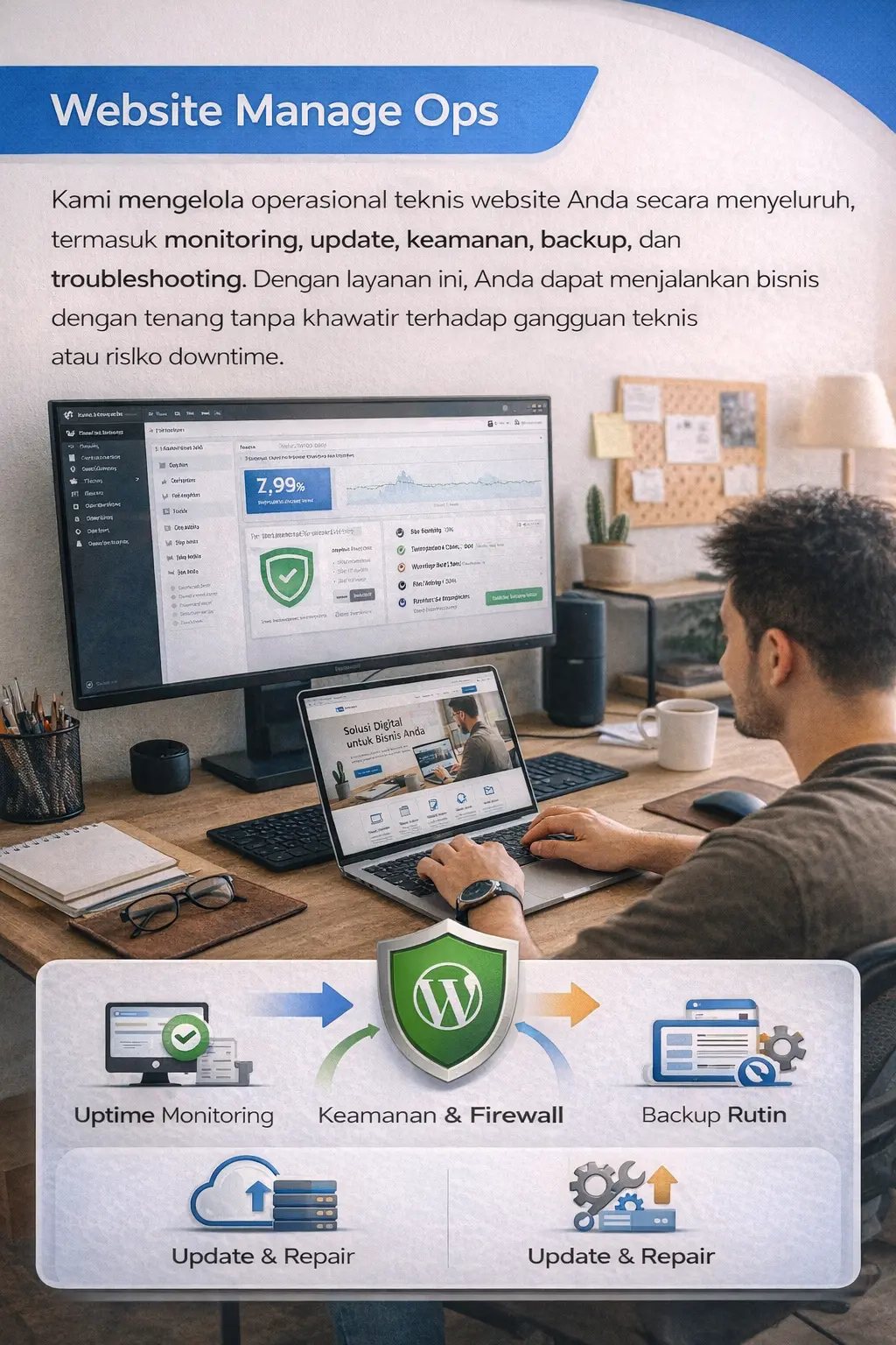 Kami mengelola operasional teknis website Anda secara menyeluruh, termasuk monitoring, update, keamanan, backup, dan troubleshooting. Dengan layanan ini, Anda dapat menjalankan bisnis dengan tenang tanpa khawatir terhadap gangguan teknis atau risiko downtime.